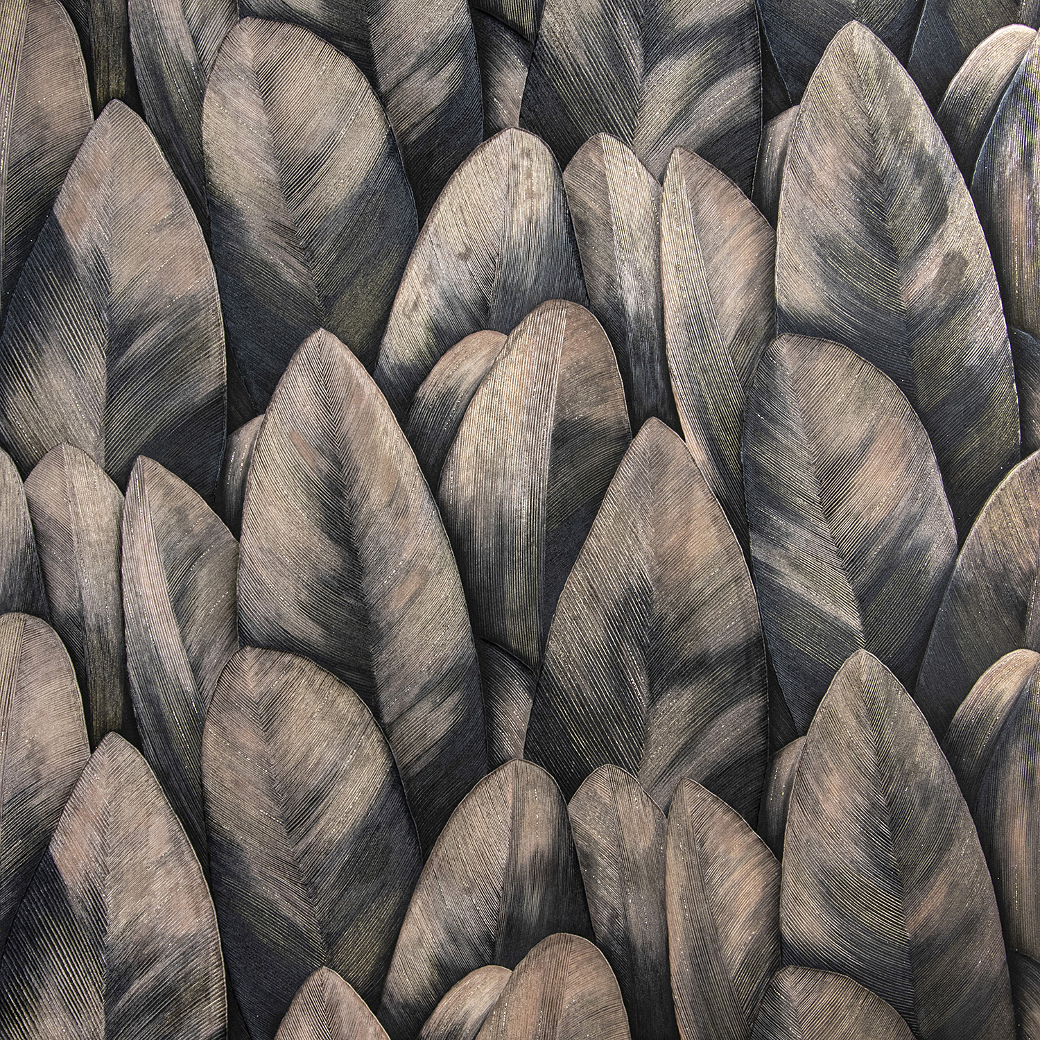 Основное полотно коллекции «Сидней»представляет собой объемные, реалистичные, переливающиеся в лучах солнечного света листья. Металлизированные краски и использование интерферента помогают создать визуально притягательный образ, передающий яркую энергетику природной красоты. Глиттер, который также задействован в декоре, добавляет дополнительное сияния и подчеркивает прожилки листвы.