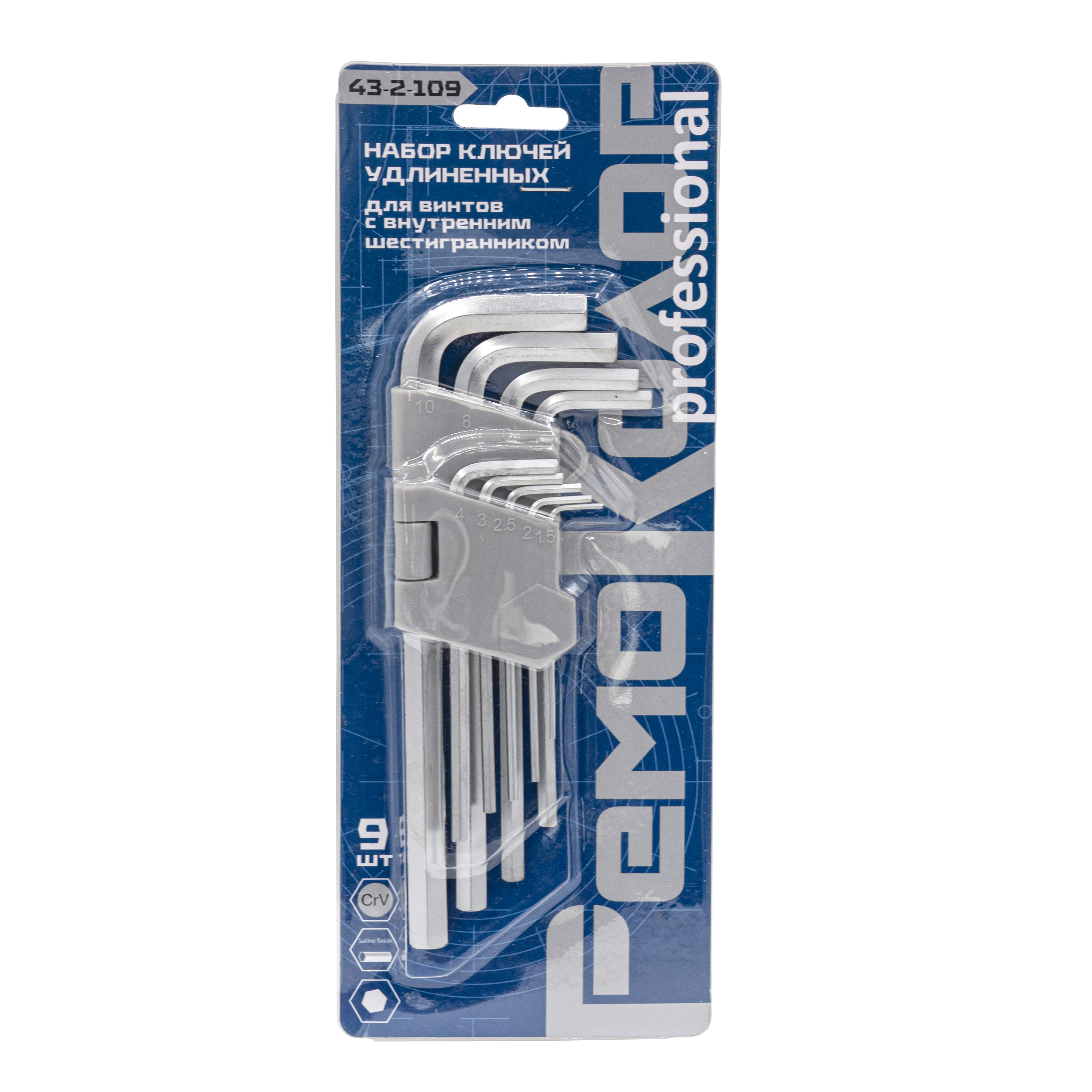 Набор ключей имбусовых 9 шт 1,5-10 мм удлиненные Cr-V сатин HEX.арт.43-2-109 Ремоколор *1/6/60