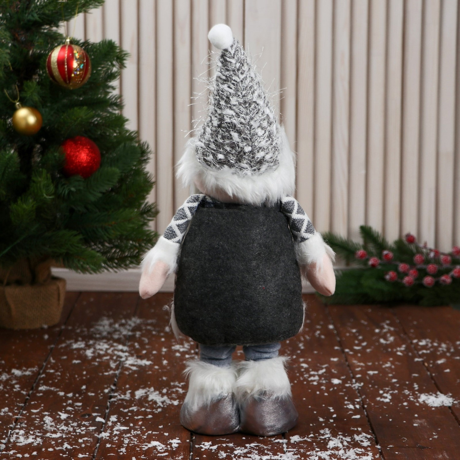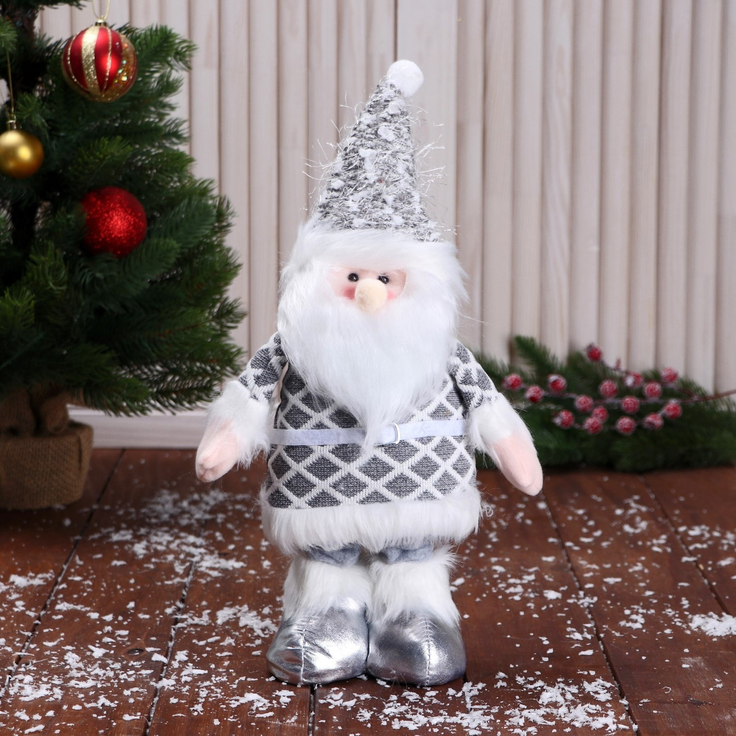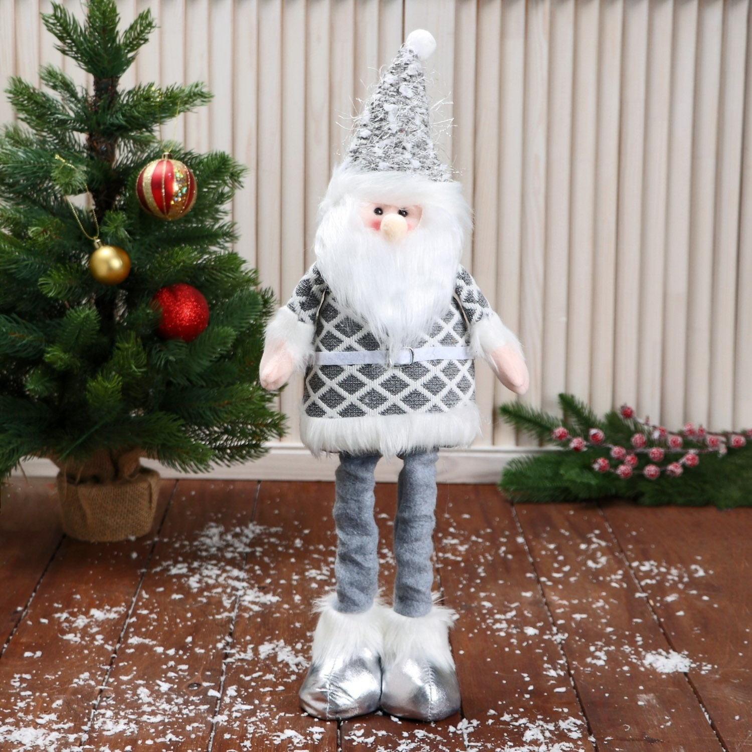 Мягкая игрушка "Дед Мороз в костюме с ремешком, длинные ножки" стоит, серый 9692548