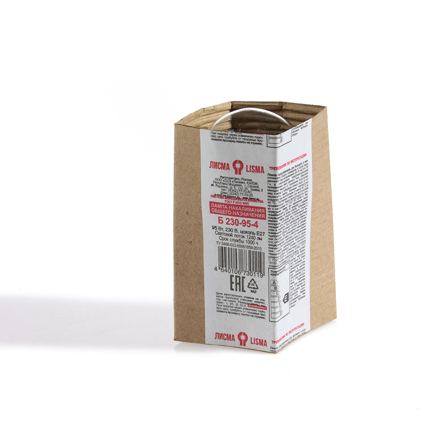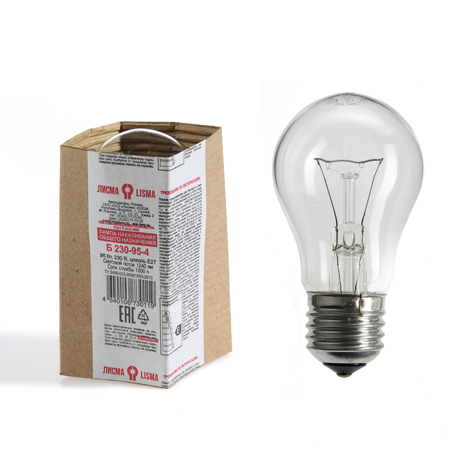 Лампа накаливания Лисма, Е27, груша, 95 Вт, 220-230 В