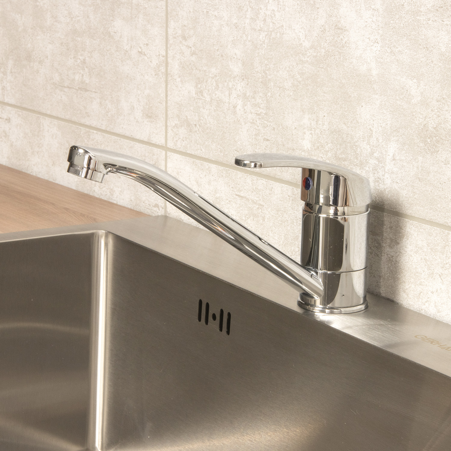 Однозахватный смеситель RC014A для кухни с верхним расположением ручки типа «С» из прочного пластика с устойчивым никель-хромовым покрытием. Крепление к столешнице или мойке осуществляется на штуцер с помощью удобной комбинированной гайки с металлической резьбовой вставкой и прокладок.