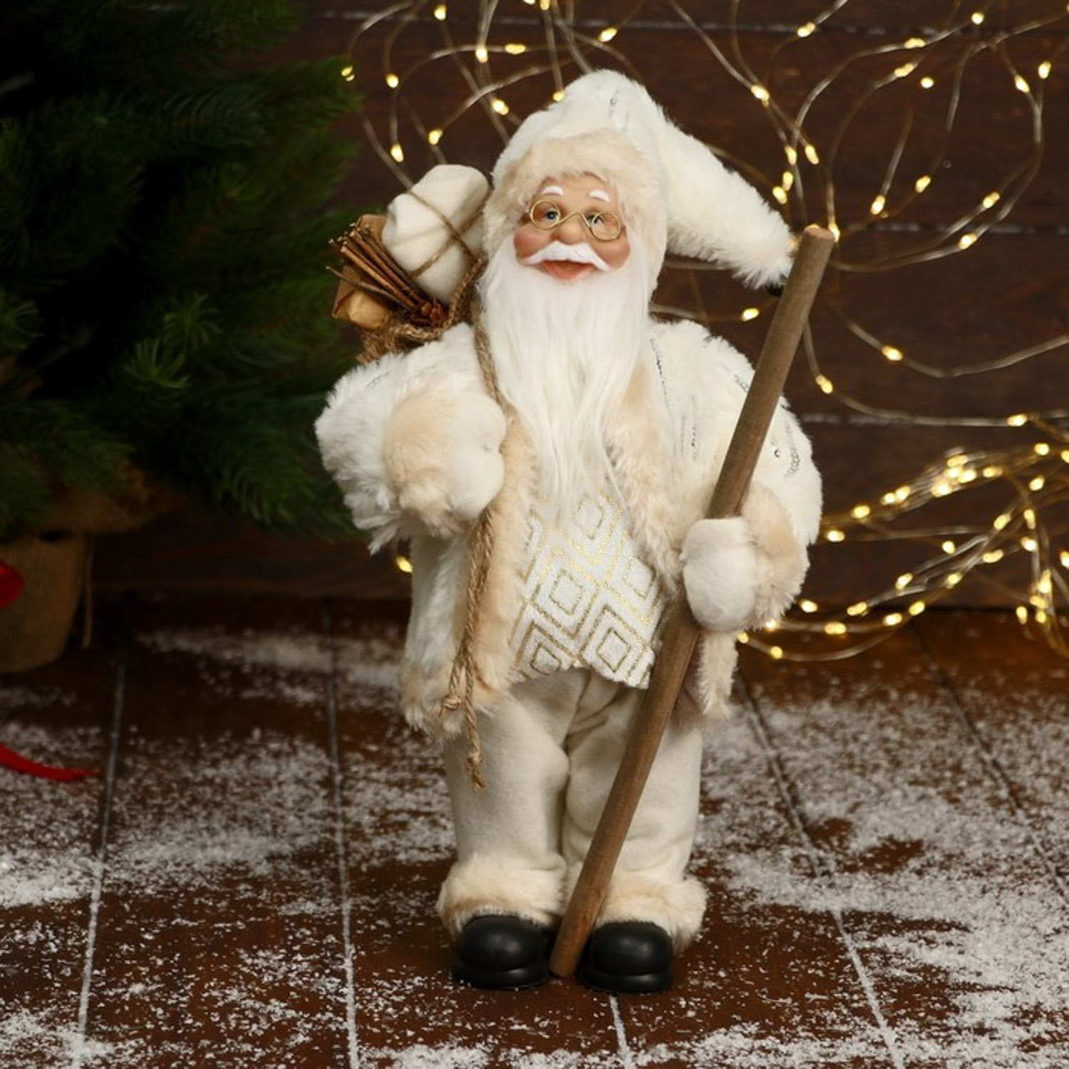 Дед Мороз "В белой шубе, кофте ромбик, с посохом и подарками" 16х30 см 6949614