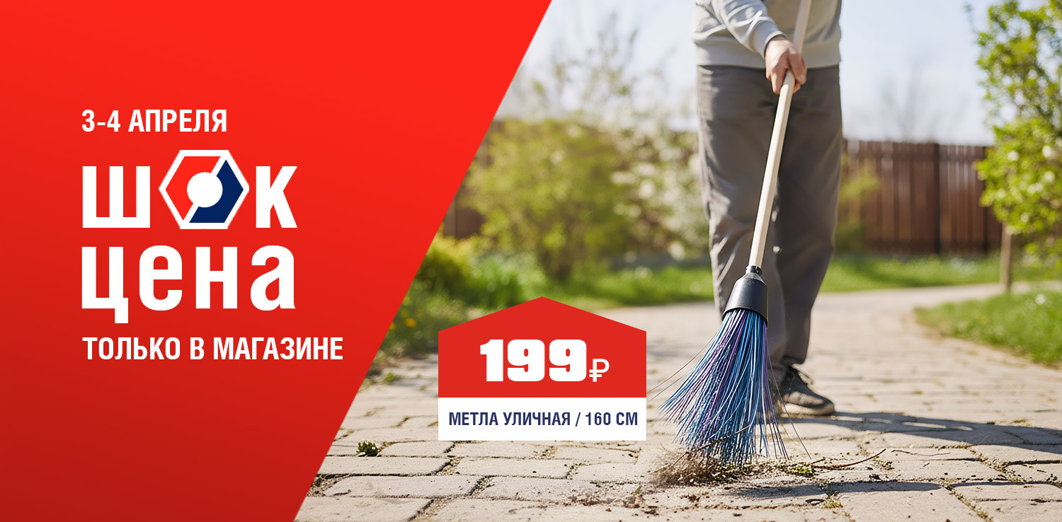 Порядок на участке требует надежного инструмента! Уличная метла длиной 160 см с черенком из березы обеспечивают удобство уборки без наклонов и надежность в работе. Широкий смет из прочных материалов гарантирует долгий срок службы, а продуманная конструкция делает уход за участком быстрым и комфортным. 3 и 4 апреля в розничных магазинах ДомоСтрой не пропустите ШОК-цену: