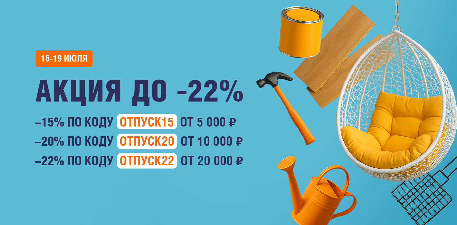 Скидка распространяется только на товары с белыми ценниками и с шильдиком «ОТПУСКНЫЕ», не распространяется на товары с желтыми ценниками, на гр. Строительные материалы и не суммируется с другими акциями (в том числе со скидкой по дисконтной карте, скидкой для пенсионеров и акцией для новоселов). При применении промокода списание бонусов станет недоступным.